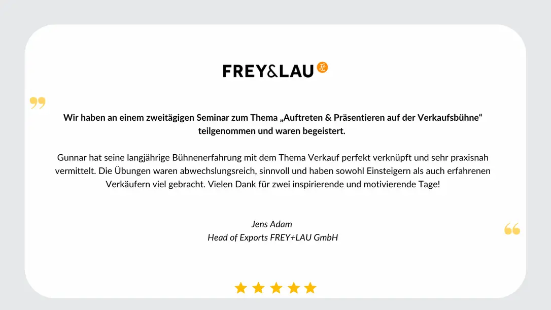 Als studierter Schauspieler und zertifizierter Business-Trainer verbindet er Auftritts– und Bühnenexpertise mit Business-Kompetenz.
