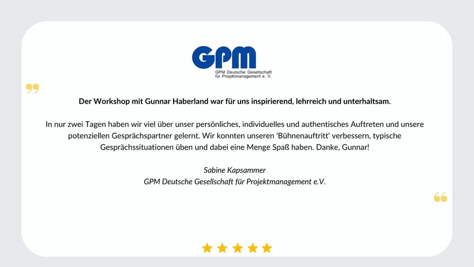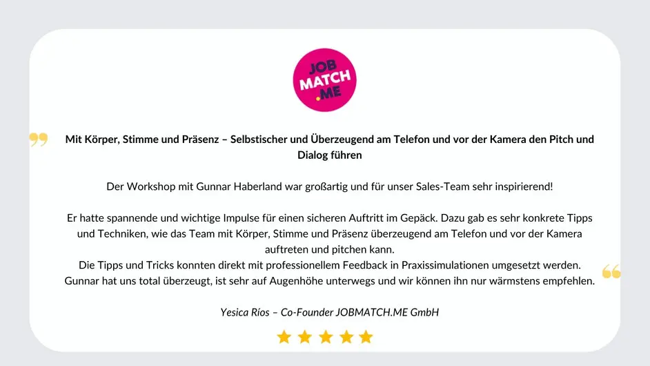 Durch das professionelles Sparring erhalten Sie klares Feedback und starke Werkzeuge, um Ihren überzeugenden Auftritt zu stärken.